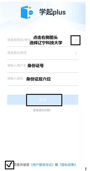 2、進入app后,選擇遼寧科技大學(xué),輸入用戶名、密碼,并同意政策