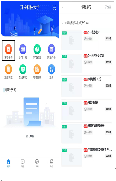 3、選擇課程學(xué)習(xí),進入課程界面,2021秋為本學(xué)期要學(xué)習(xí)的課程。